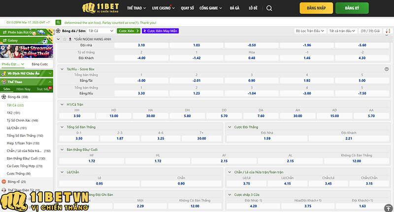 Cá cược thể thao bóng đá 11BET – Uy tín Hợp pháp – Đa dạng kèo